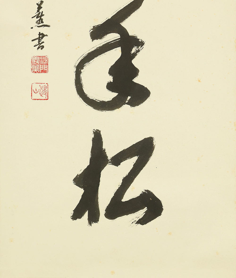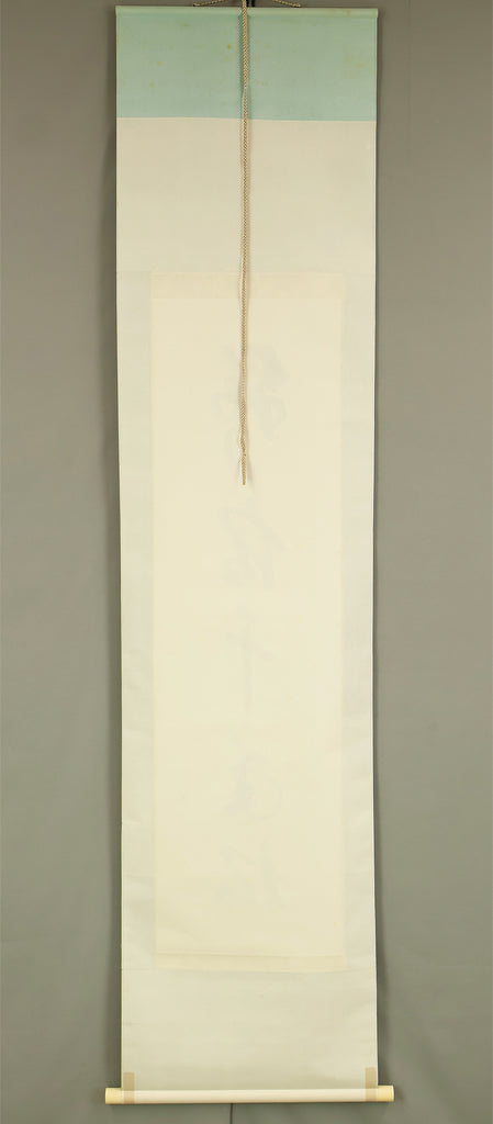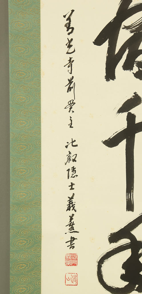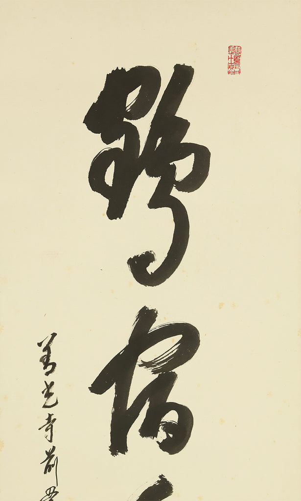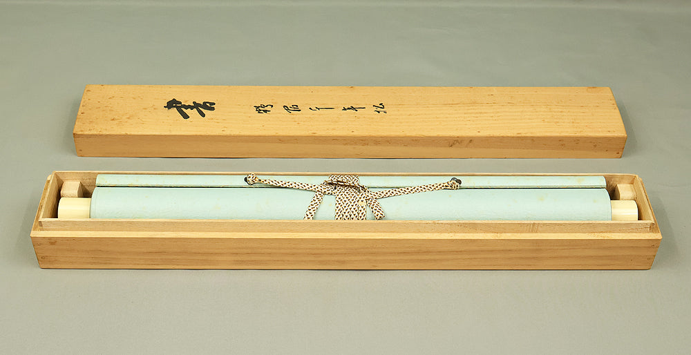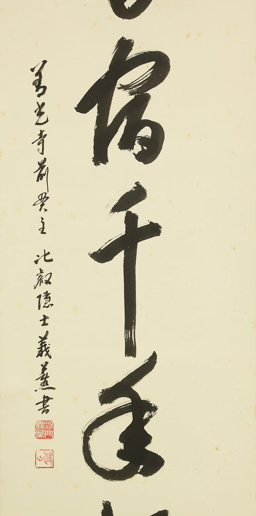 Carried by bold, resonant strokes, this hanging scroll by Miura Gikun, head priest of Zenko‑ji of the Tendai school, presents the auspicious phrase 鶴舞千年松—a blessing that envisions a crane in graceful flight above a thousand‑year‑old pine, symbols of longevity, resilience, and enduring prosperity. Gikun’s brush moves with a confident, rhythmic energy: the characters rise and fall like breath, their forms grounded yet spacious, allowing the meaning of the phrase to unfold with quiet authority. The composition balances strength and elegance, the ink settling into the paper with a natural cadence that reflects the calligrapher’s training and spiritual discipline. Signed “Gikun sho” with the seals “Shamon Gikun” and “Shozan”, the work carries the presence of a seasoned temple master whose writing embodies both ritual clarity and poetic warmth. Accompanied by its original box (Tomobako), the scroll has been carefully preserved. Displayed within an interior, it brings a dignified, uplifting atmosphere—its imagery of crane and ancient pine offering a timeless wish for longevity and steady, flourishing fortune.