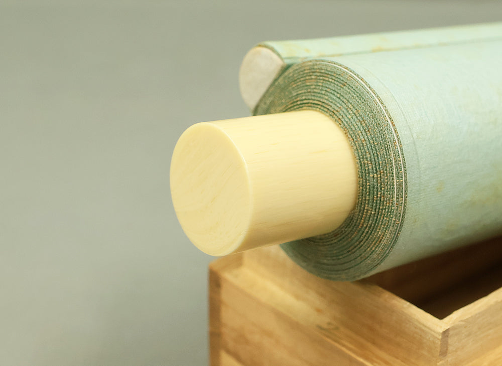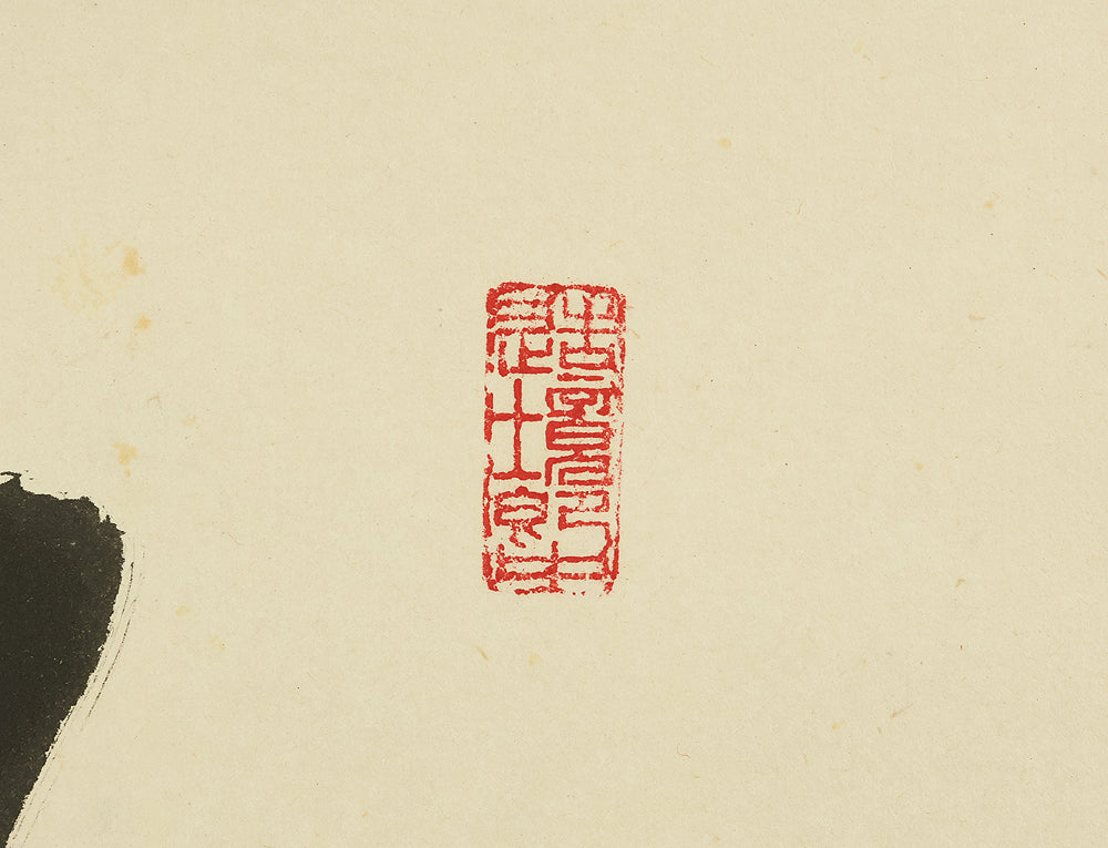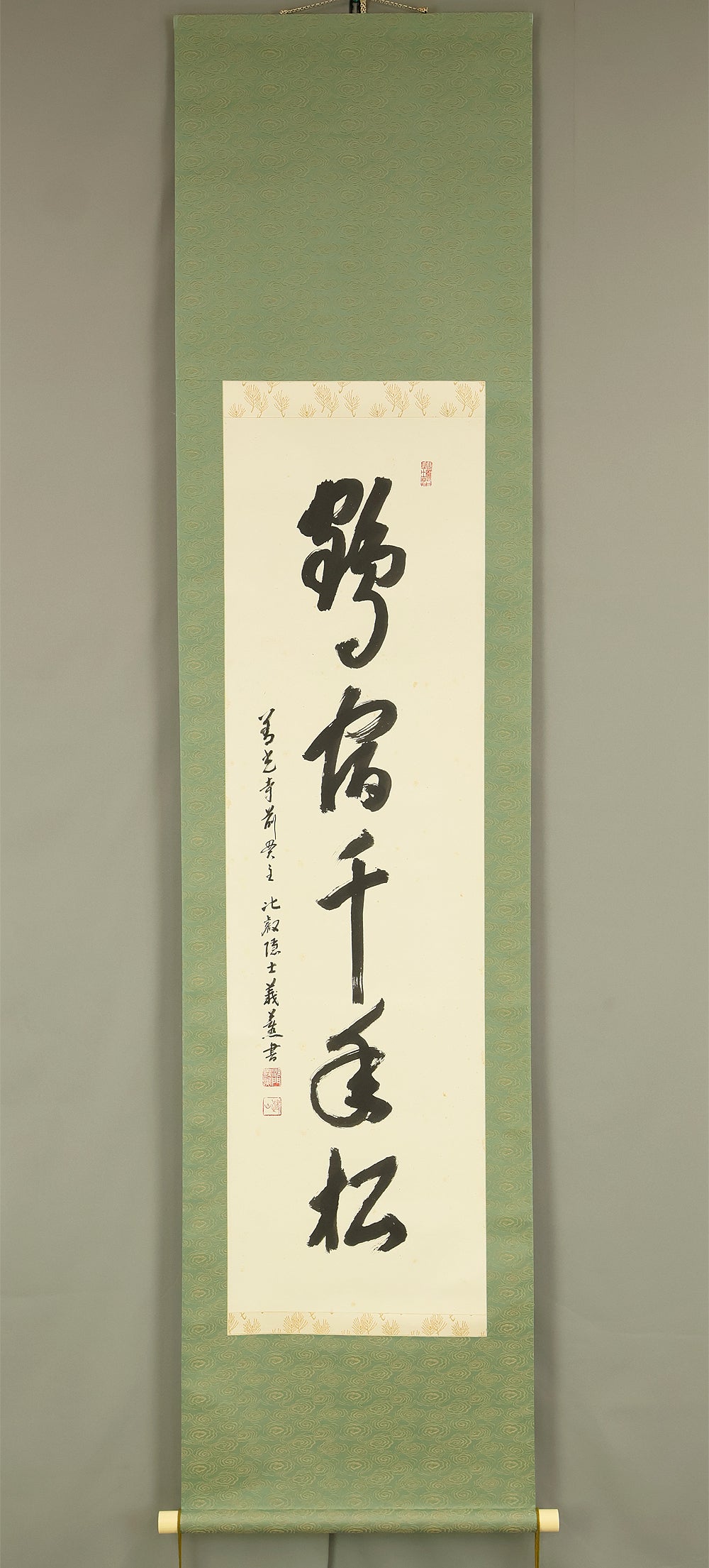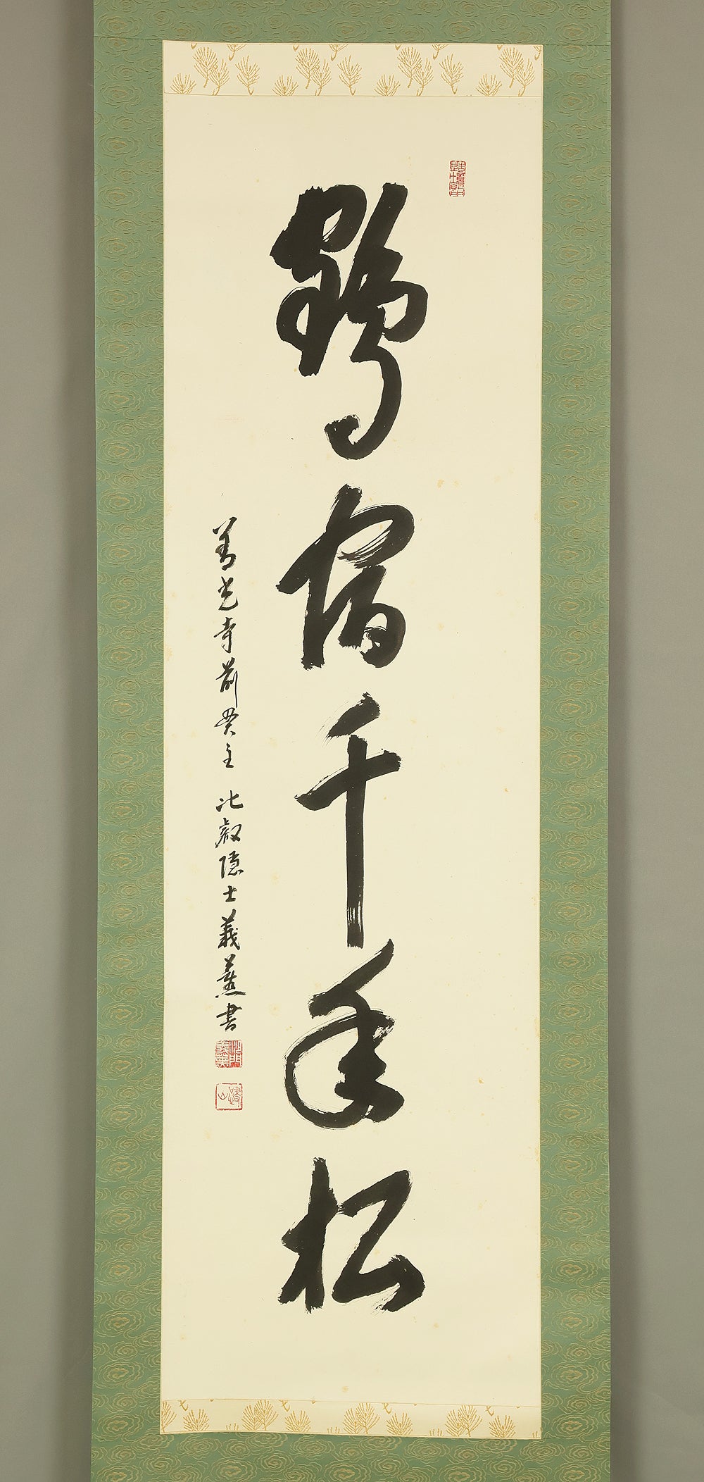 Carried by bold, resonant strokes, this hanging scroll by Miura Gikun, head priest of Zenko‑ji of the Tendai school, presents the auspicious phrase 鶴舞千年松—a blessing that envisions a crane in graceful flight above a thousand‑year‑old pine, symbols of longevity, resilience, and enduring prosperity. Gikun’s brush moves with a confident, rhythmic energy: the characters rise and fall like breath, their forms grounded yet spacious, allowing the meaning of the phrase to unfold with quiet authority. The composition balances strength and elegance, the ink settling into the paper with a natural cadence that reflects the calligrapher’s training and spiritual discipline. Signed “Gikun sho” with the seals “Shamon Gikun” and “Shozan”, the work carries the presence of a seasoned temple master whose writing embodies both ritual clarity and poetic warmth. Accompanied by its original box (Tomobako), the scroll has been carefully preserved. Displayed within an interior, it brings a dignified, uplifting atmosphere—its imagery of crane and ancient pine offering a timeless wish for longevity and steady, flourishing fortune.